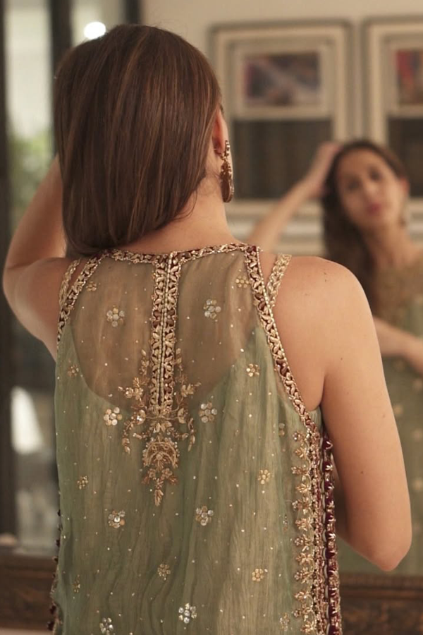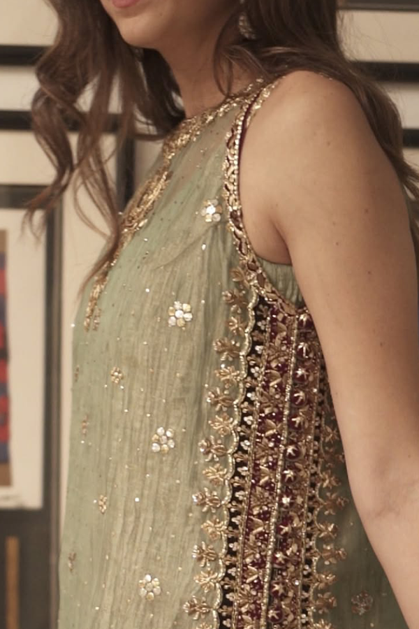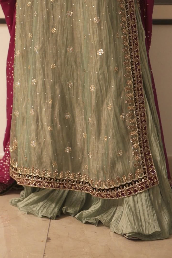 Embrace timeless elegance with Zareen, a breathtaking ensemble that exudes refined beauty and festive grandeur. Designed in a soft, soothing pastel green, the long flowing silhouette is crafted from delicate net or organza, gracefully adorned with intricate embroidery and subtle hand embellishments that shimmer with understated elegance.