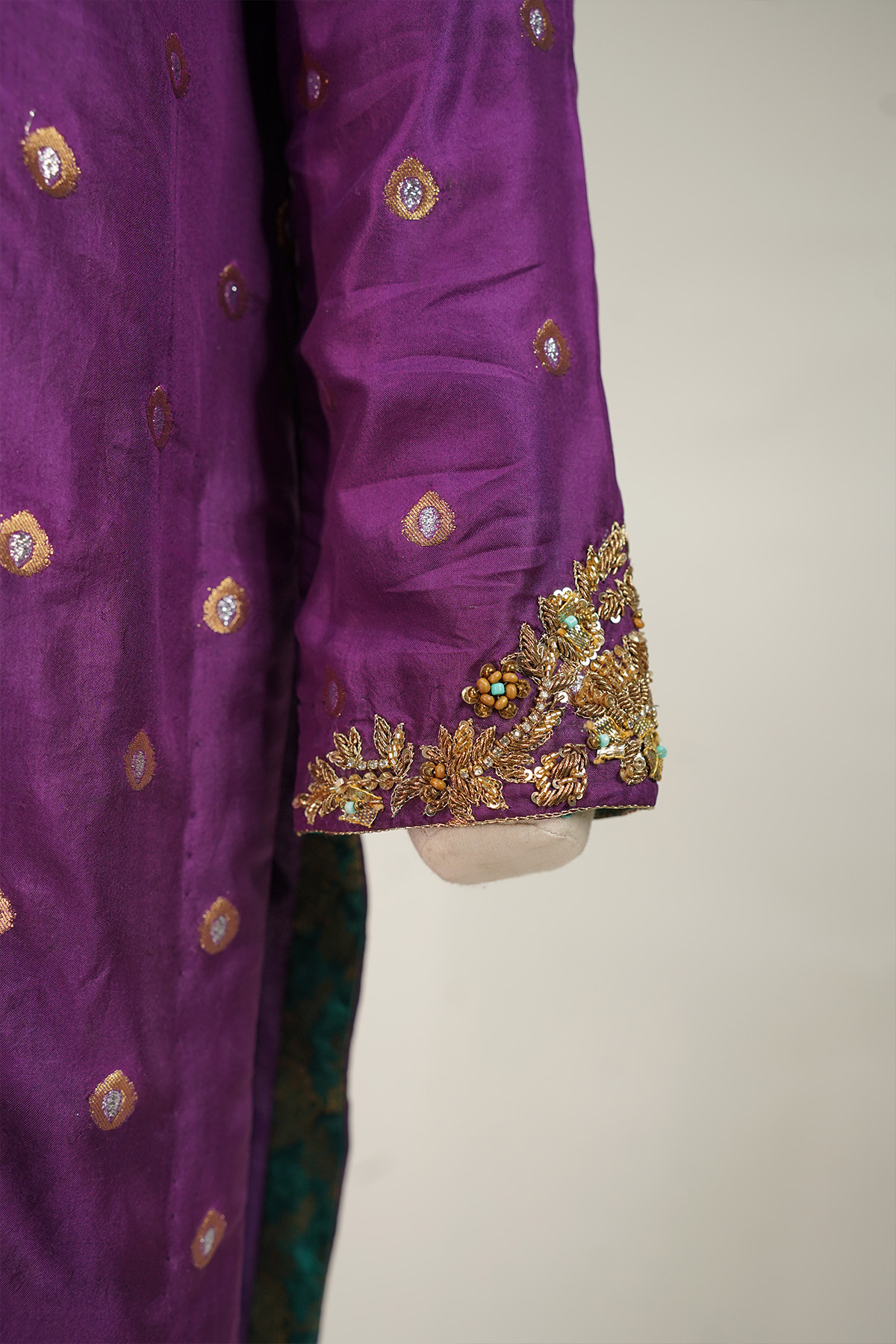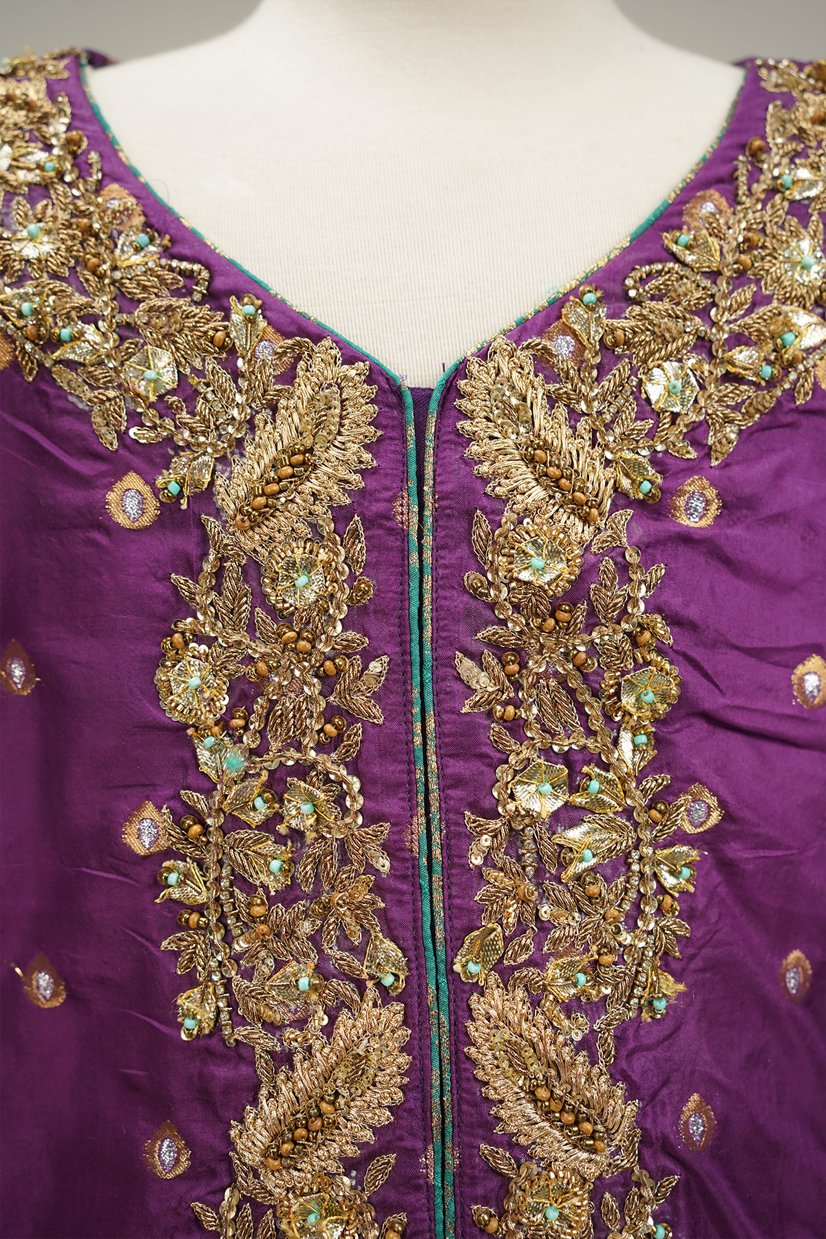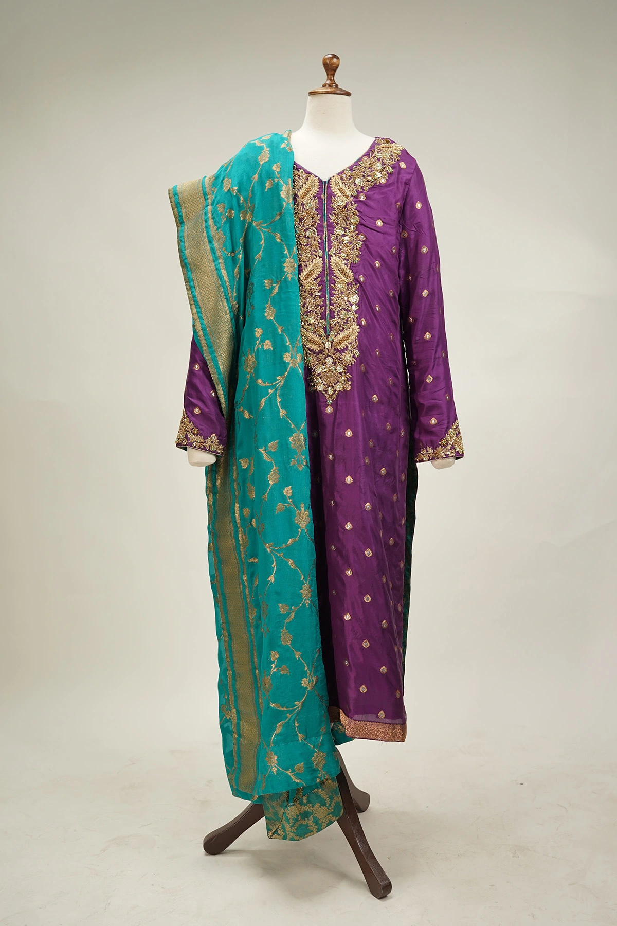 This Majestic-Plum ensemble is perfect for a classic formal/semi-formal wear. Adorned with hand-embroidered intricate motifs in golden zardozi and gota work on the neckline and sleeves, accentuated by turquoise and bronze beadwork to add the perfect color contrast. Paired with a pure banarasi dupatta in turquoise to perfectly complement the plum color and serve a timeless silhouette.